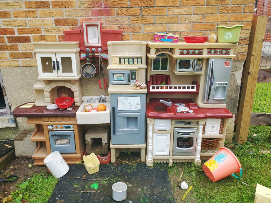 We already had the kitchen to the left, but today we found the smaller kitchen to the right & set them up side by side to make one larger kitchen so the kids have more space to work without constantly bumping into each other.