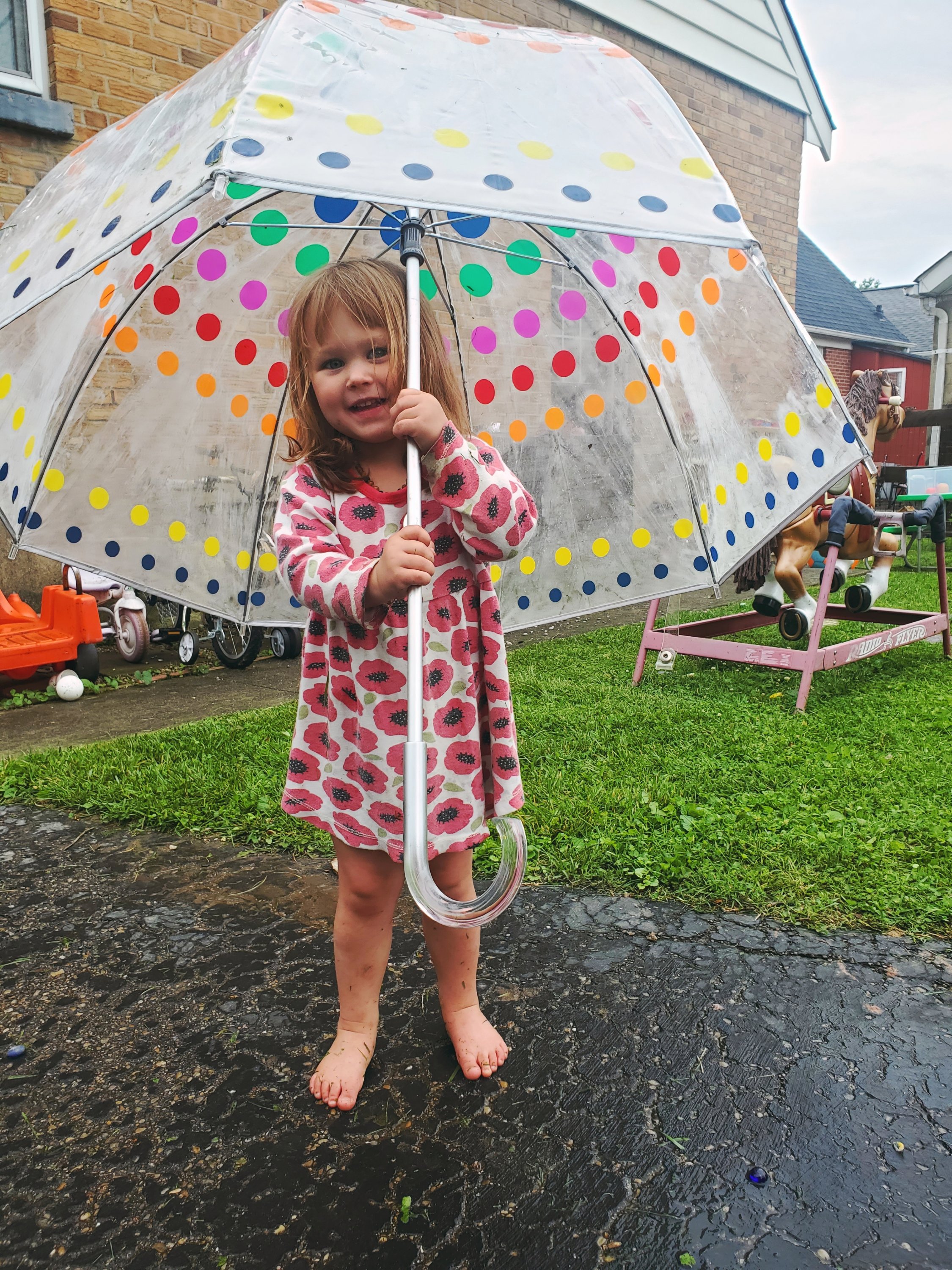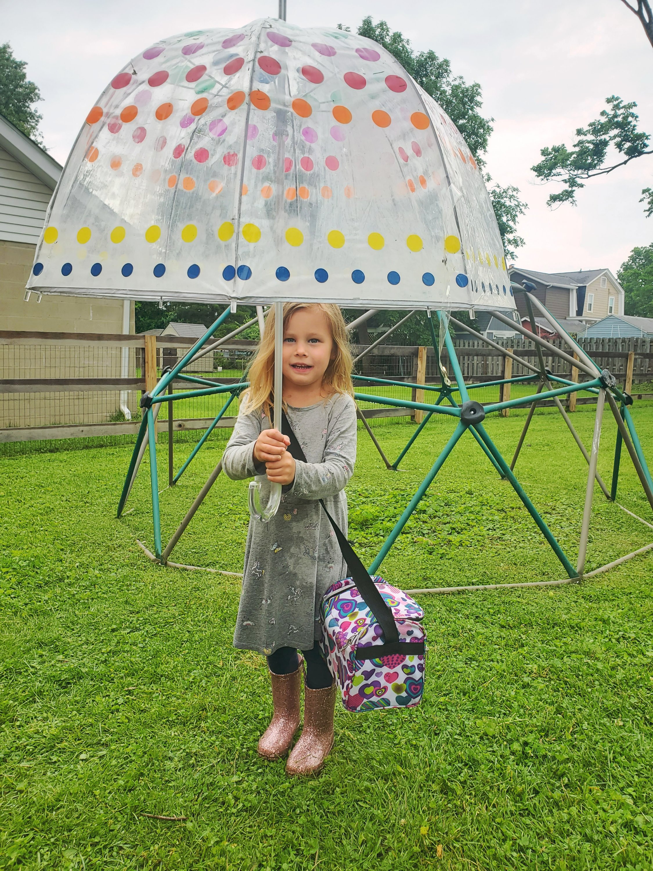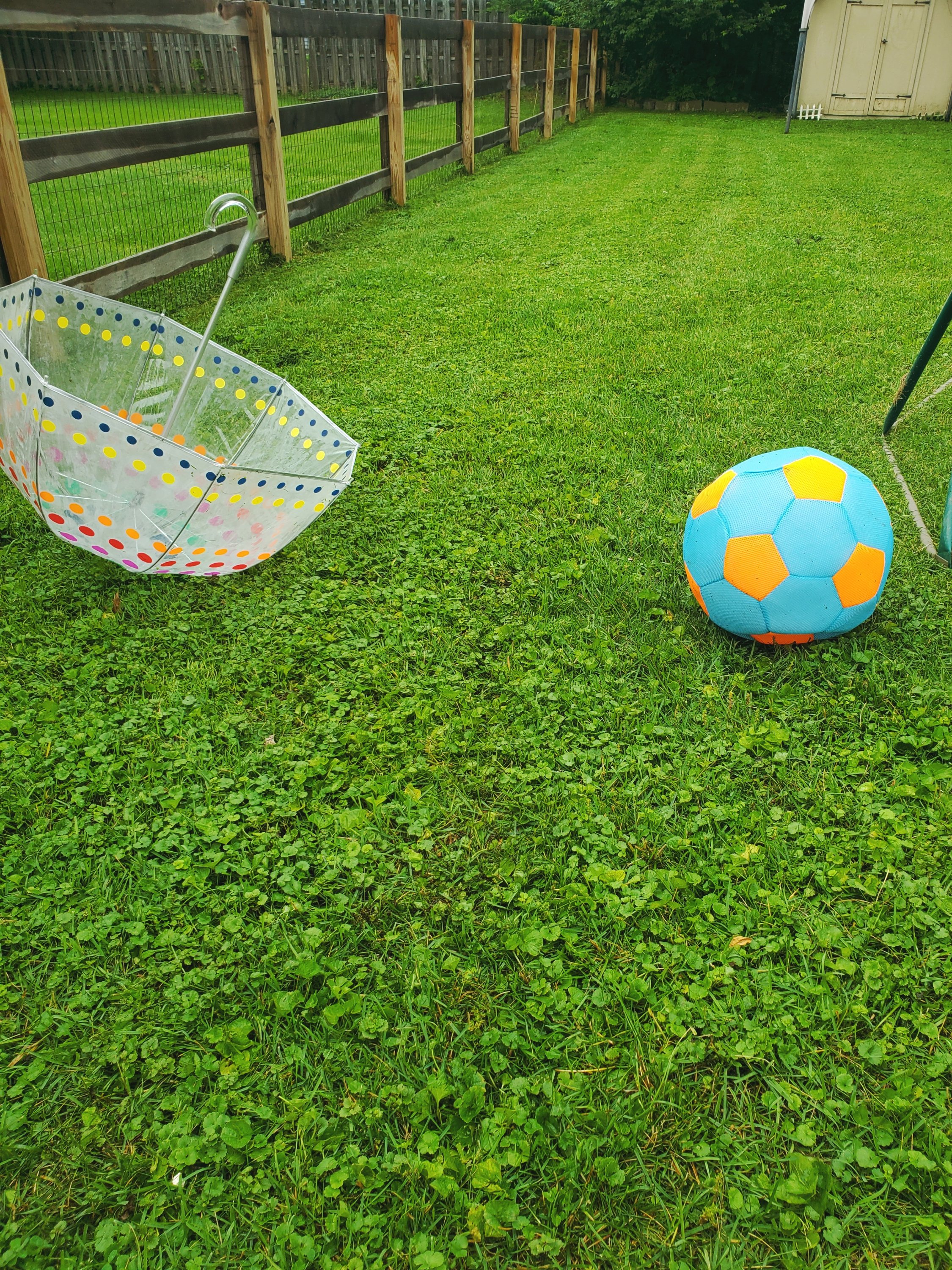 The kids have been having a *ball* 😉 playing with this giant soft soccer ball. Sasha has been really big into umbrellas lately so she was very happy to find this cute colorful one.