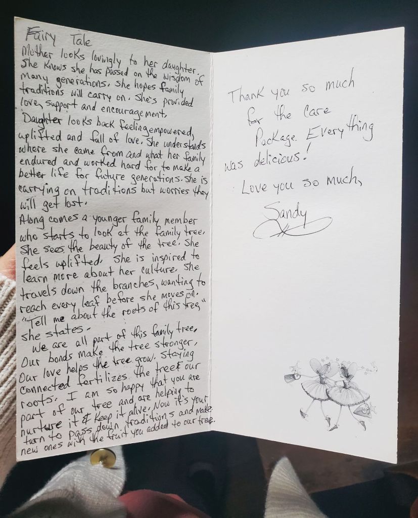 That made me cry when I opened it and read it. Sandy has 2 boys, but had hoped her whole life for a little girl. Her brother, Shawn, also has 2 boys. I was the little girl of the family- for this reason, to be the third fairy. To carry on family traditions and grow stronger roots, making sure our culture does not get lost over the years.