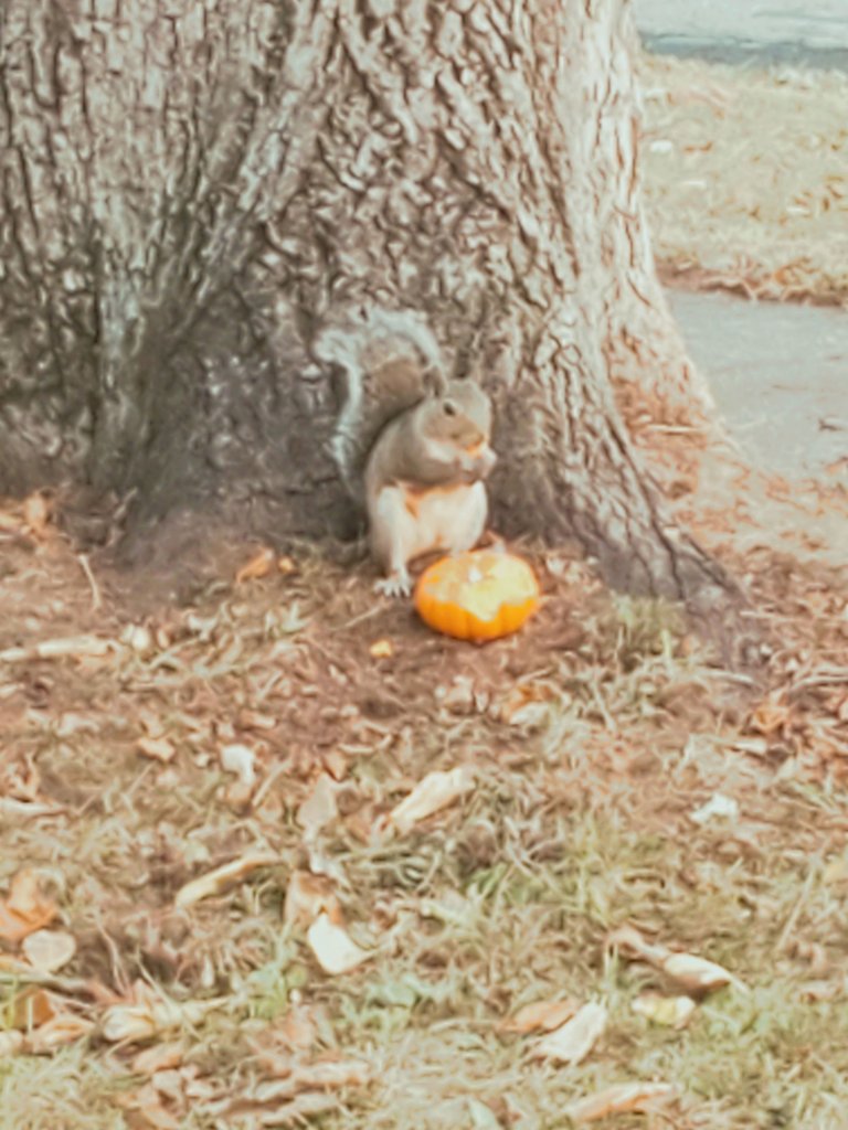 Our own little mini pumpkin patch The fat little squirrel that has been stealing all of my pumpkins! This year I got fake pumpkins to put in the hanging basket. I got the last two packages at Target and will hopefully find a few more next year to be able to fill the basket. I think the real pumpkins I used last year looked much nicer, but I will be able to get much more use out of reusable ones for many years to come.