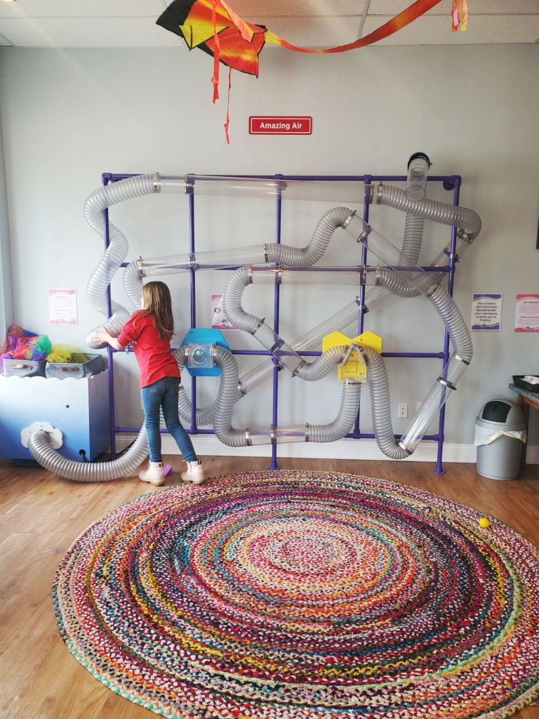 The main room had a few building stations including tracks, pvc pipes, Legos, and miscellaneous wood building stations, the Amazing Air station, and a rocket launcher.