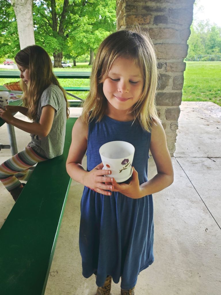 Ella really enjoyed learning how to fold napkins at the first station. I particularly liked her napkin with the flower pocket. I would like to start setting our own table napkins that way for fancy meals & gatherings. It is so beautiful & will be an interesting way to use our flowers from our garden.