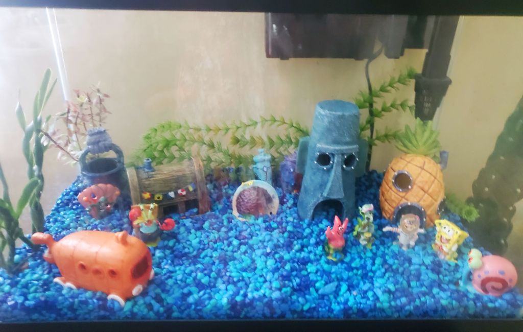The kids have been setting up their little Fishtank in the dining room for the past year now! They decided to go with a SpongeBob theme in their fish tank, and it ended up looking so cute!