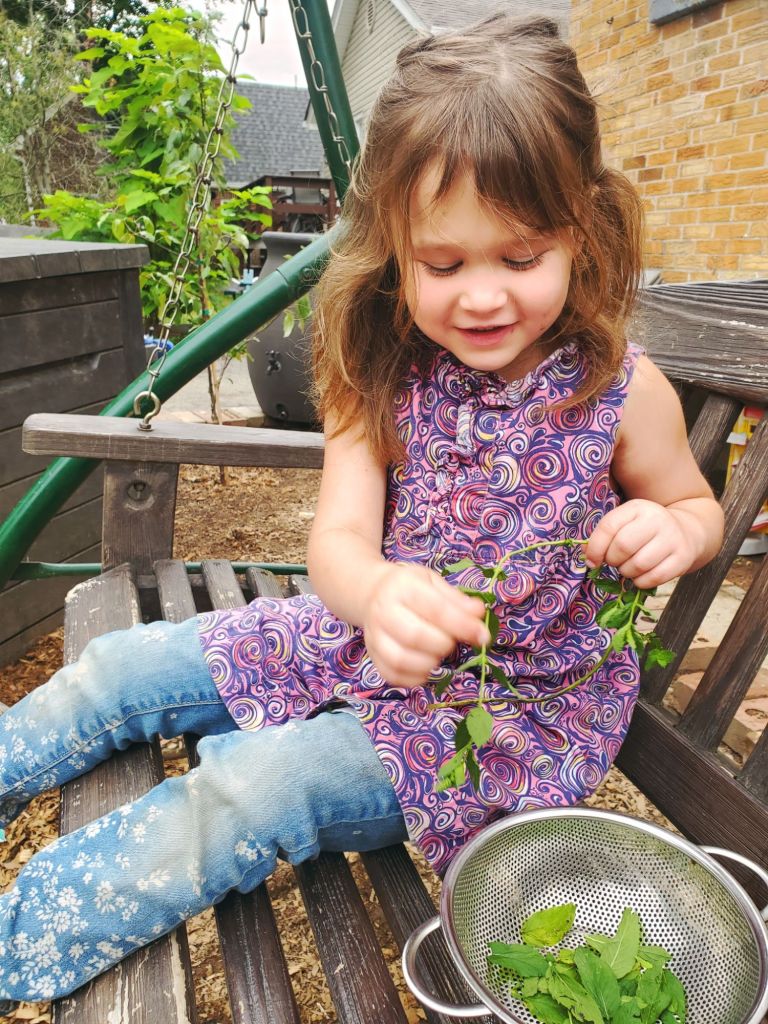 After we collected enough mint, we sat down together on the swing and picked off all of the leaves and placed them in this mini colander to be cleaned once we were back in the kitchen.