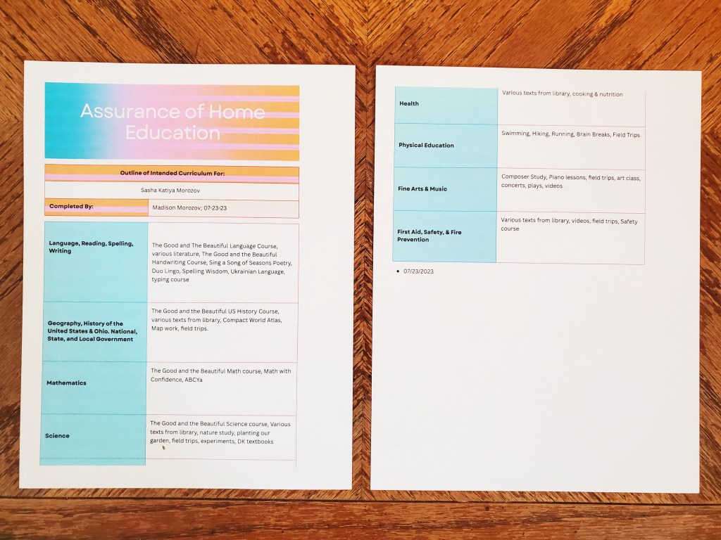 She typed it up, printed it out for me, and I’m not kidding you I thought there is surely no way a school is going to accept this, but she says it’ll do. So I printed out the legal Intent to Homeschool Document for my state (Ohio), filled it out, and sent these papers out in the mail.