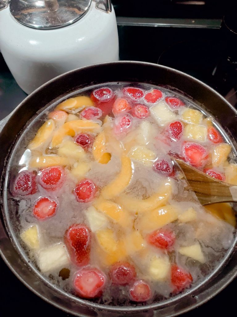 Kompot is so great because in the summer you can serve it cold, then in these cold, winter months you can serve it warm like tea. It’s a great way to use up fruit that is turning mushy, but not yet moldy. Instead of throwing those away, place them in a gallon-size ziplock bag in your freezer. Once you fill a bag, use it for making Kompot to cut down on food waste & enjoy a delicious fruit drink.